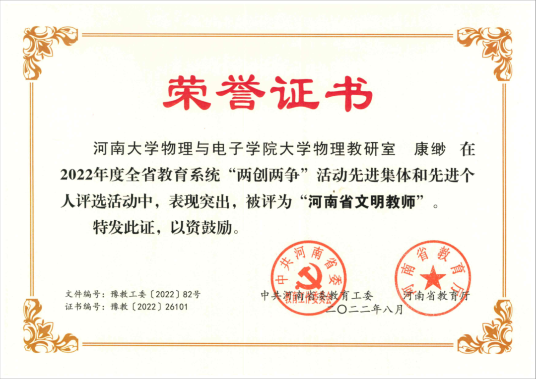 为深入学习贯彻习近平新时代中国特色社会主义思想,不断提升广大教职工思想觉悟、道德水准、文明素养和文明程度,中共河南省委教育工委、河南省教育厅在全省教育系统开展了“两创两争”群众性精神文明创建活动。此次评选中,我校共有4名教师入选“河南省文明教师”,物理与电子学院物理教研室教师康缈位列其中。