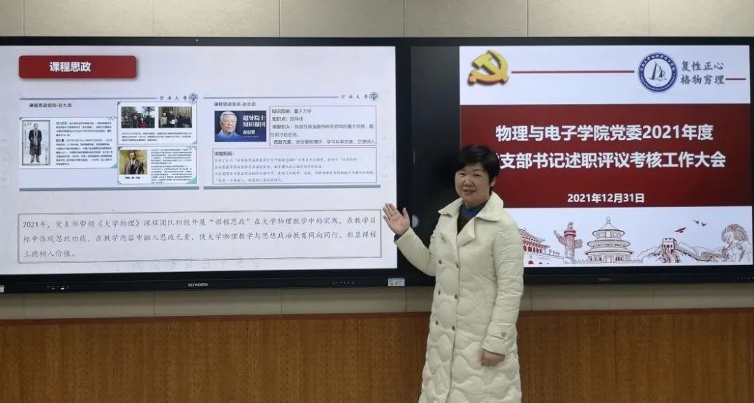 2019年3月起,在学院党委的大力支持下,大学物理教工党支部主办了多期“混合式”教学改革研讨会、一流课程建设、课程思政教学案例研讨交流等活动,在活动中,老师们对大学物理课程教学方式方法进行了充分交流和讨论,不仅为大学物理教学团队的教学改革和建设打下了坚实的基础,也创新了“党建+教研”育人新模式,党建创新工作成效显著。最近两年,大学物理教工党支部先后获批河南大学先进基层党组织、第二批全省高校省级样板党支部、第三批全国党建工作样板支部培育创建单位。党支部连续三年被评为河南大学先进党支部,康缈也获得河南省文明教师、河南大学优秀党员和优秀党务工作者等荣誉称号。
