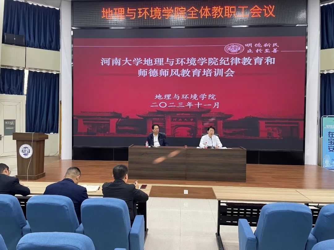 师德,是教师之根;师风,是教育之魂。为进一步加强师德师风建设,引导学院教师坚守教育初心,践行育人使命,推进学院事业高质量发展,地理与环境学院召开师德师风建设专题教育大会,同时邀请校党委教师工作部副部长赵炎作题为“树良好师德师风,做河南大学好老师”的专题讲座。会议由学院党委书记乔家君主持,学院领导班子成员及全体教师参加。