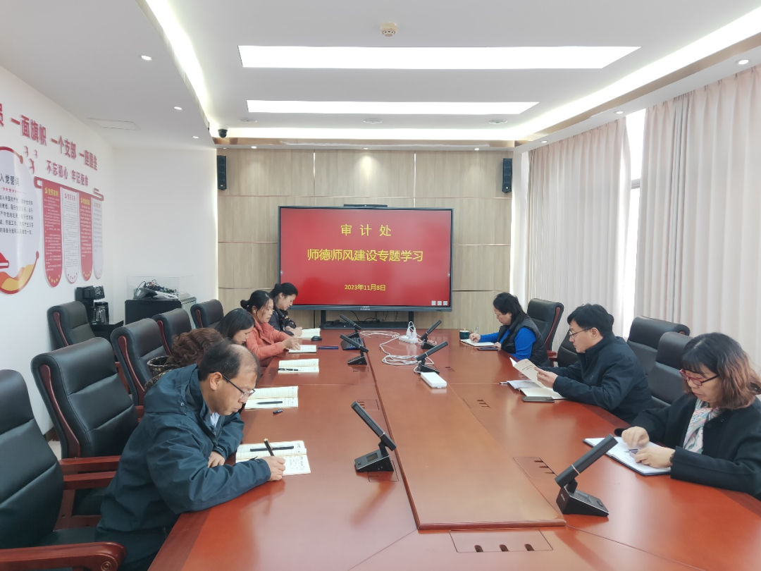 2023年11月8日,按照学校《关于持续开展师德集中学习教育的通知》精神和要求,审计处组织全体人员开展师德师风建设专题学习。会议由处长陈河山主持。