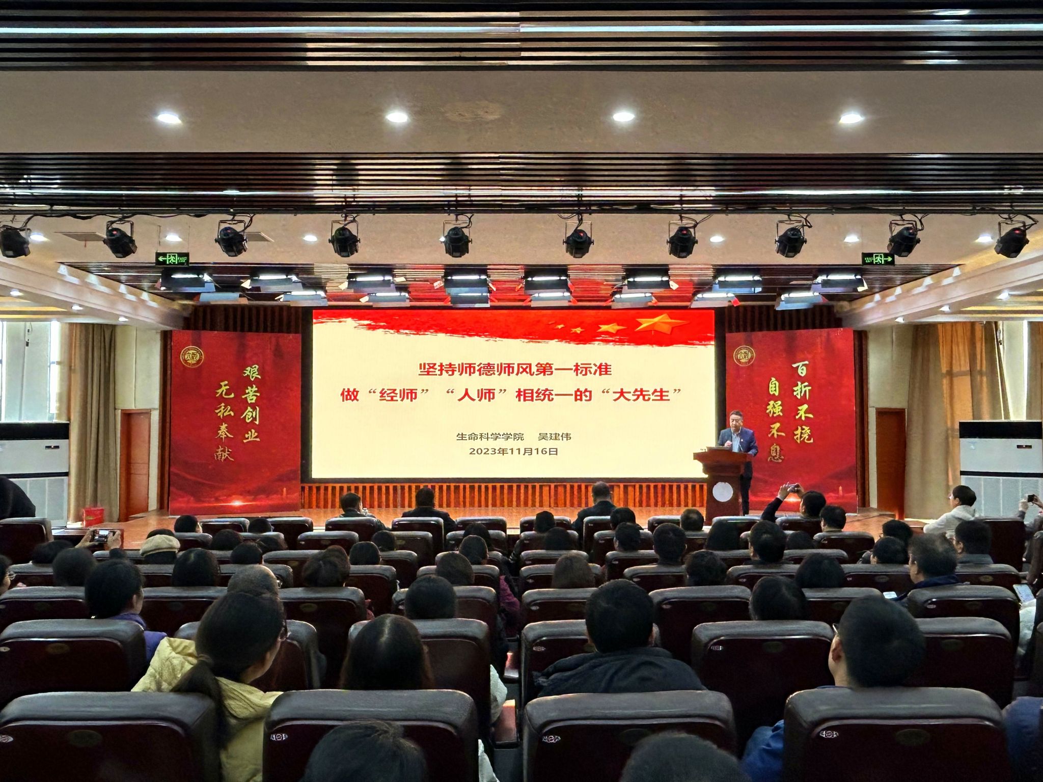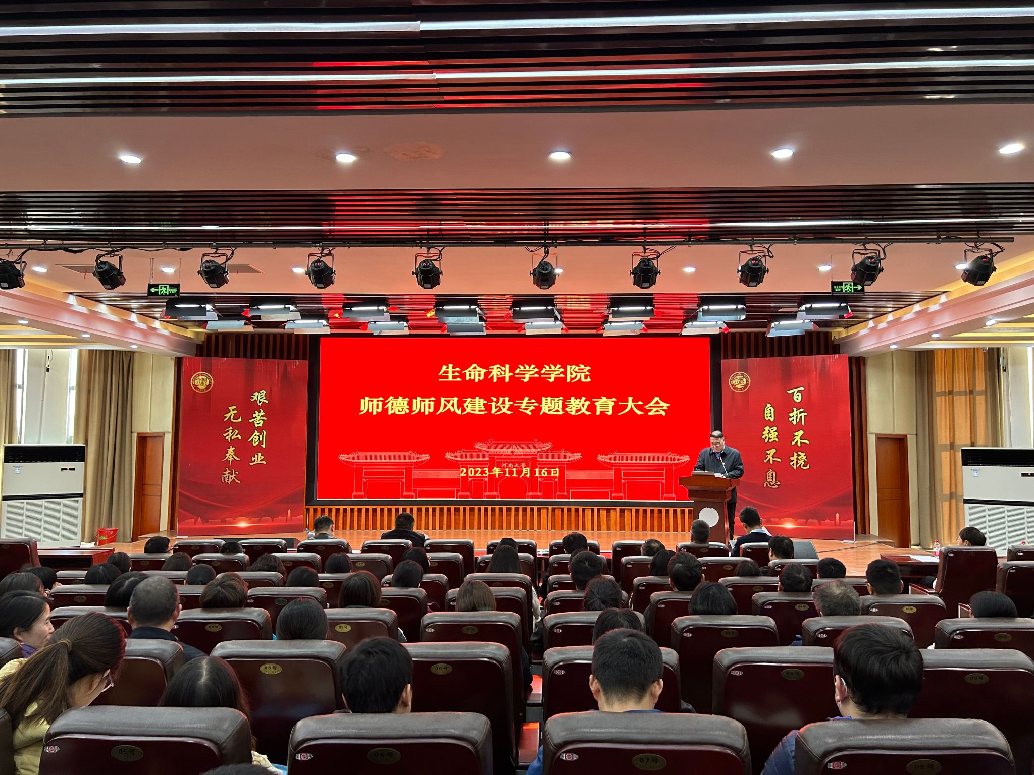 按照学校统一部署,为进一步加强学院师德师风建设,全面提高教师思想政治素质和职业道德素养,11月16日下午,生命科学学院在圆楼报告厅召开师德师风专题教育大会。生命科学学院、棉花生物育种与综合利用全国重点实验室、省部共建作物逆境适应与改良国家重点实验室全体教职工参加学习。会议由学院党委副书记宋永鹏主持。