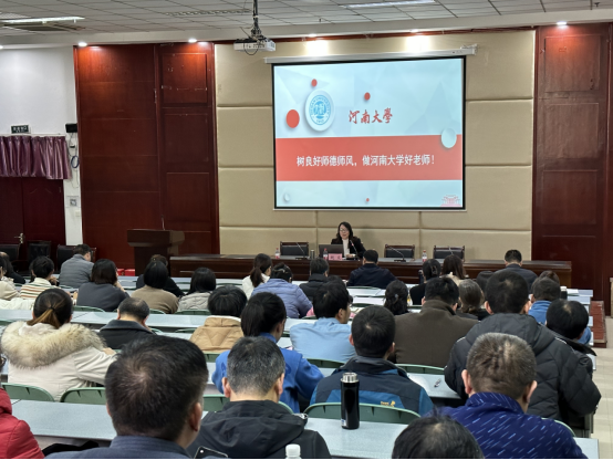 赵炎以《树良好师德师风,做河南大学好老师》为题,围绕“师德师风的重要性、如何加强师德师风建设、做什么样的好老师”三个问题,对《新时代高校教师职业行为十项准则》进行了深入解读,并结合近年来教育部公开曝光的高校师德失范典型案例对《关于高校教师师德失范行为处理的指导意见》、《河南大学教师师德失范行为处理办法》进行了详细介绍,倡议并提醒老师们应当自觉加强师德修养,严格遵守师德规范,严以律己、为人师表。