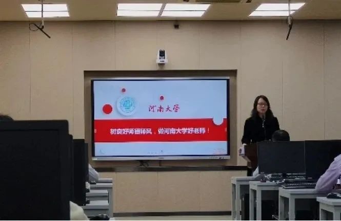 赵炎作了题为《树良好师德师风,做河南大学好老师》的专题报告,围绕“师德师风的重要性”“高校师德师风规范要求”“做什么样的好老师”三个方面,深入剖析了新时代高校师德师风建设的形势与任务。她结合近年来教育部公开曝光的高校师德失范典型案例,深入浅出的讲解了师德师风建设的重要意义和规范准则。她强调,学校对师德失范行为“零容忍”,学院需要通过严格的管理制度和日常的监督制度来落实落细各项工作任务。