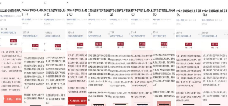 一是选树身边榜样。连续十年举办“我最喜欢的老师”评选活动,通过选树教师榜样,鼓励广大教师见贤思齐,形成“爱岗敬业,创优争先”的良好风尚;推荐学院教师在各级各类榜样选树活动中创优争先,引导广大教师学先进、做先进,如俄语系教师陈学貌博士被授予第七届“河南大学青年五四奖章”,俄语系骨干教师闫吉青参与首届河南大学教书育人楷模评选;举办外语学院年度人物评选活动,充分发挥先进典型的示范带动和价值引领作用,为实现外语学院高质量发展凝心聚力;推出“暑期中的外语人”系列推送,记录教师们充实忙碌的暑期生活,激励广大教师脚踏实地、步履不停。二是致敬师德楷模。广泛报道吴雪莉、张玉滚、李芳等心怀“国之大者”的大先生的英雄事迹,引领广大教师以德修身、以德育人。