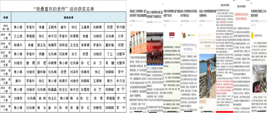 外语学院自2014年起,连续十年开展“我最喜爱的老师”、“百川讲堂”、“外院无虚席”等教师榜样选树、宣传、学习活动,涌现出一大批以吴雪莉、徐盛恒、王宝童、徐有志、吕长发、高继海、张克定、牛保义、郭尚兴、刘辰诞、刘泽权、杨朝军等教师为代表的“红烛先锋”,通过发挥榜样示范引领辐射作用,带动全院教师立师德、强师能、塑师风、铸师魂。