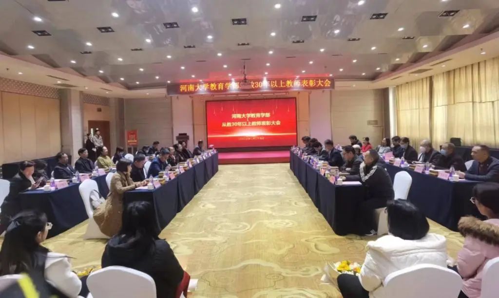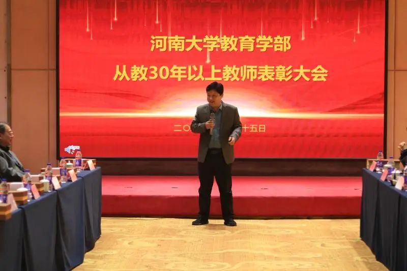 为弘扬中华民族尊师重教的优良传统、向多年来深耕在一线的教育工作者致敬,2023年2月25日上午在金明校区中州颐和酒店,教育学部举行了“从教30年以上”教师表彰大会。教育学部领导班子成员、从教30年以上的32名教师出席了本次会议,参加会议的还有32名来自不同专业的学生代表。大会由学部党委副书记王刚主持。