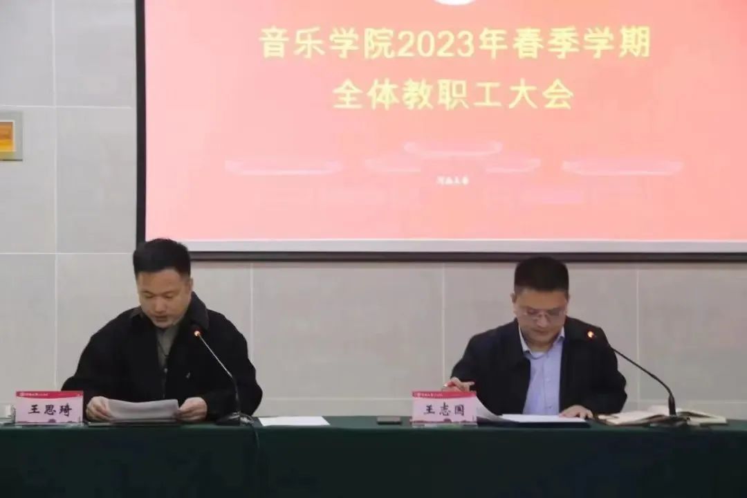 为进一步凝聚力量,谋划新篇,确保各项工作有序开展,2月23日,音乐学院在学术报告厅隆重召开2023年春季第一次全院教职工大会。院党政领导班子成员及全体教职工参加了会议。会议由学院党委书记王志国主持。